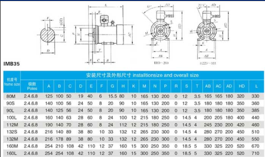 B35的安裝參數(shù)是有兩個端蓋式軸承,有底腳,傳動端端蓋上凸緣,凸緣上有通孔,有軸伸,借助底腳安裝并附用凸緣安裝。