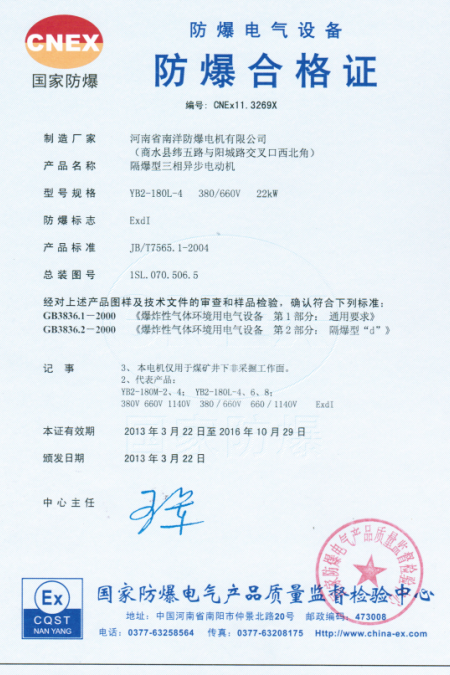 下面是YB2-180L-4-22KW防爆電機(jī)的防爆合格證和煤安證,有了這兩種證明,就可以證明YB2防爆電機(jī)繼續(xù)可以為煤礦服務(wù)了。