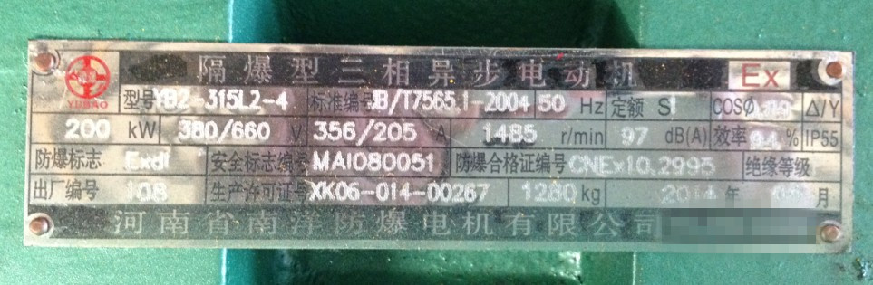 上面羅列的YB2系列防爆電機的型號315L2-4,功率200KW,電壓380/660V,電流356/205A,轉速1485r/min,效率94%,防護等級IP55,防爆標志EXDI,絕緣等級F,重量1280KG,生產日期2014年9月,頻率50Hz等等。在上面都可以找到。而標準編號表示的是YB2系列防爆電機一定要符合這個標準才算是合格產品,最重要的就是上面的安全標志編號、防爆合格證編號和生產許可證號一定要與給到咱們的各種證件上面一一對應。要是對不上一定要通知廠家要求重新發(fā)貨。