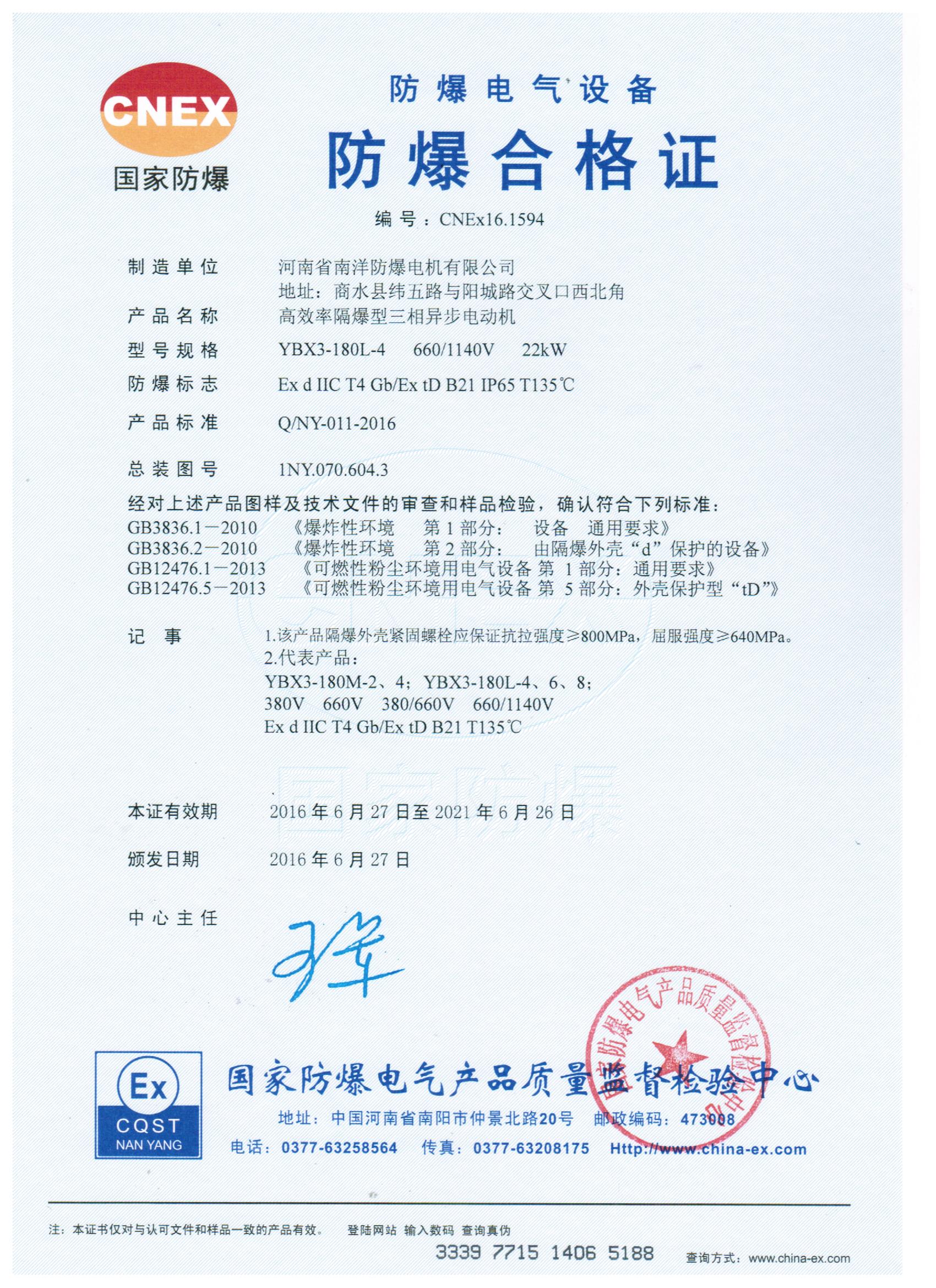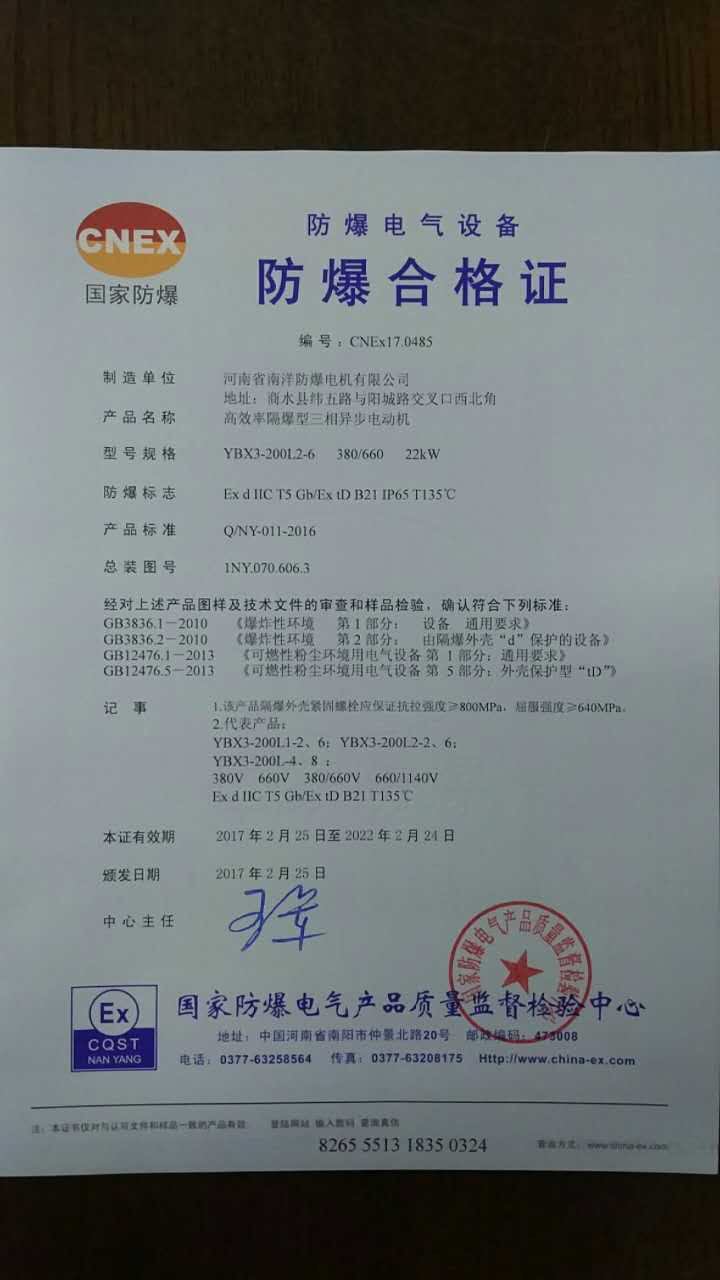 河南省南洋防爆電機有限公司全體員工經(jīng)過不懈努力,潛心專研,榮獲了由國家防爆電氣檢測中心,頒布的YBX3高效節(jié)能防爆電機防爆等級EXDIICT5,防護等級IP65的防爆合格證,為廣大企業(yè)的安全生產(chǎn)提供了有力保障。