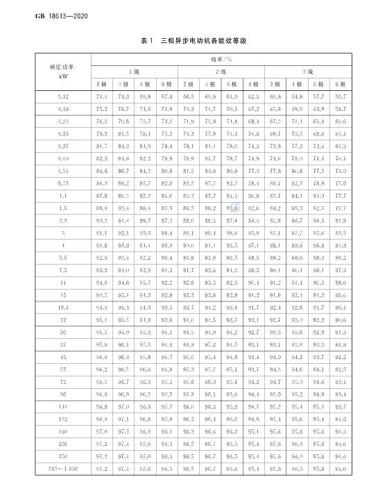(2)提高了對三相異步電動(dòng)機(jī)能效限定值要求(見表1,GB18613-2012的表1和GB 25958—2010的表1);
