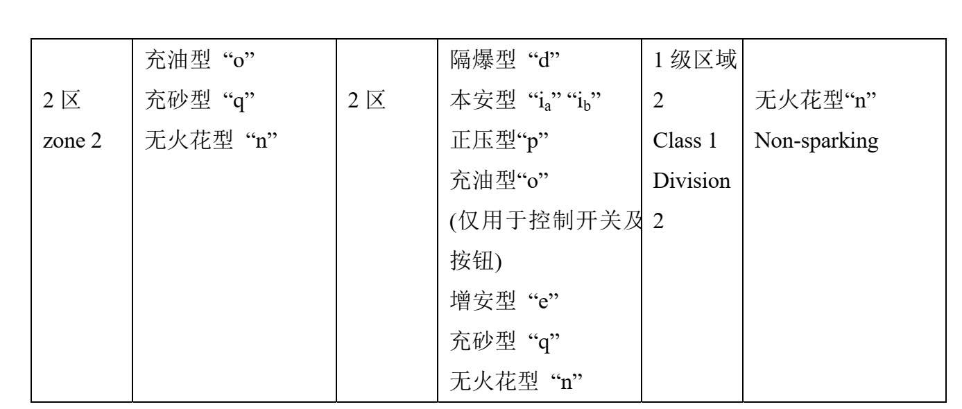 注:1于0區(qū)的防爆設備可用于1區(qū)和2區(qū);用于1區(qū)的設備可用于2區(qū);
